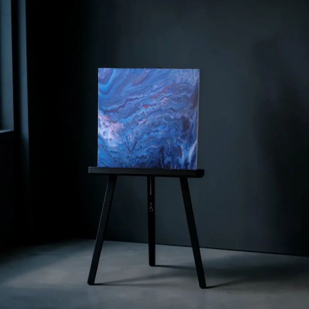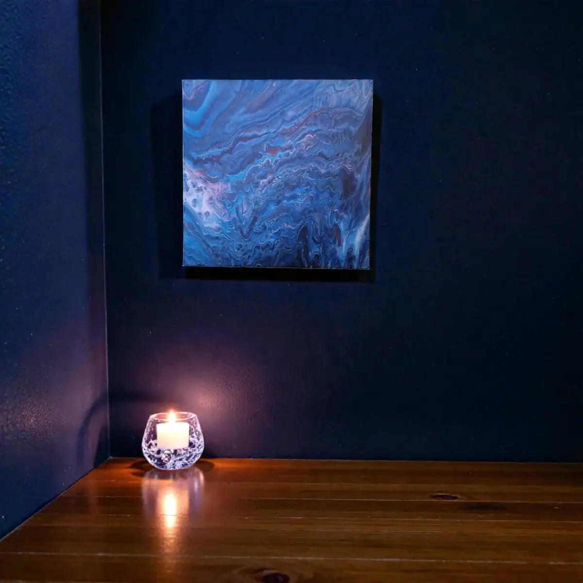 Plasti modrih tonov spominjajo na valovanje vode, večerno nebo ali tiste tihe notranje premike, ki jih opazimo šele, ko se malo umirimo. Nevsiljiva dinamika v motivu ji daje občutek živosti, a brez nemira. V njej ni ostrine — samo gibanje, ki pomirja.
