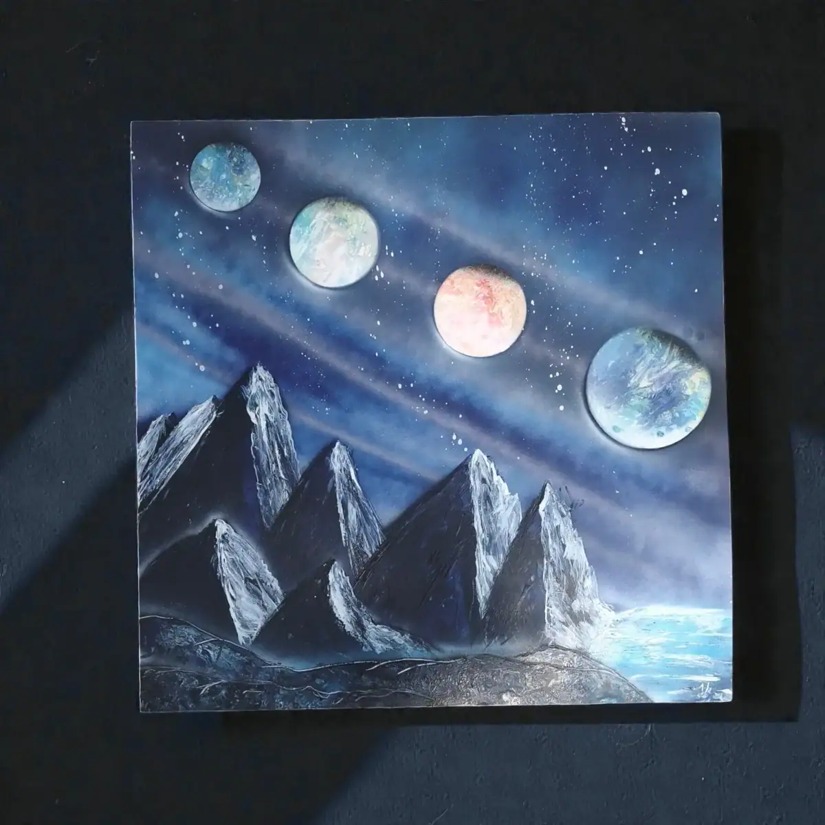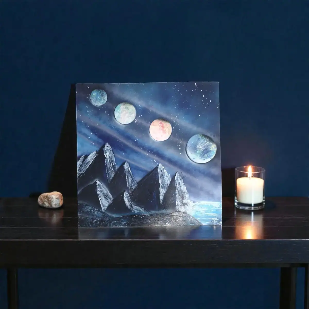Temne gore dajejo občutek stabilnosti in prizemljenosti, planeti pa v kompozicijo prinesejo širino, domišljijo in tisti znani občutek, da ni treba vsega razumeti, da bi nekaj začutil/a. To je slika za kotičke, kjer si želiš več miru. Za steno, ki ne potrebuje veliko besed. Za prostor, kjer želiš ustvariti atmosfero tišine, globine in rahle skrivnostnosti.